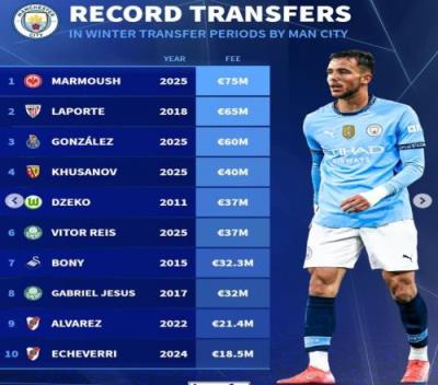 曼城冬窗引援榜:马尔穆什7500万欧居首,冈萨雷斯6000万欧第3