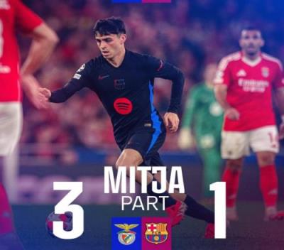 半场巴萨暂13本菲卡什琴斯尼出击失误+送点帕夫利季斯戴帽