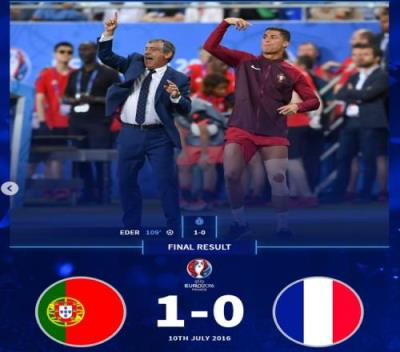 2016年欧洲杯决赛葡萄牙1-0法国:几乎一己之力扛着葡萄牙闯进决赛的C罗伤退,他在场边指挥比赛的场面也成为经典,最终替补神兵埃德一剑封喉,帮助葡萄牙夺得队史欧洲杯首冠。