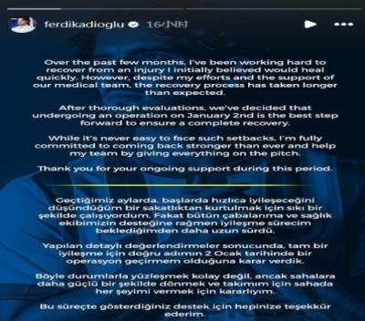 体育资讯1月3日报道宣称 去年11月份,卡迪奥卢因为左脚大脚趾关节囊撕裂而退出土耳其国家队集训大名单,而后一直未参加比赛。今天他在ins上发文确认自己进行了手术,全文如下: