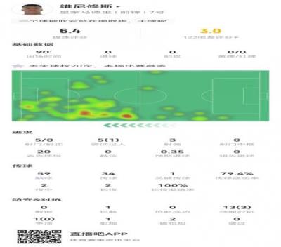 维尼修斯本场5射0正5过人1成功14对抗3成功6.4分全场最低