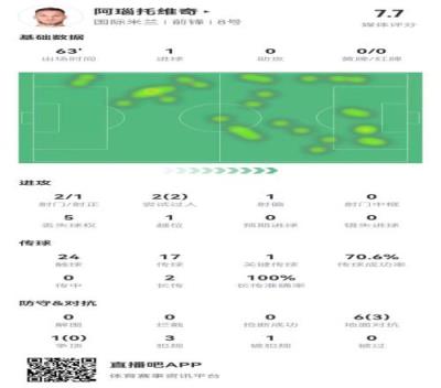 阿瑙托维奇本场2射进1球+1关键传球7对抗3成功+3犯规获评7.7分