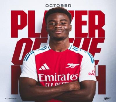 萨卡10月为阿森纳出战4场比赛,打进3球,并送出2记助攻,阿森纳官方社媒晒出萨卡的精彩表现集锦,宣布他当选队内10月最佳球员。