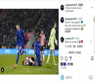 此役第77分钟,恩佐送出直塞,恩昆库得球摆脱防守后倒地,帕尔默跟进将球打进球门。对于“抢了”队友恩昆库的进球,帕尔默社媒写道:“顶级胜利,(球迷的)顶级支持。抱歉了,恩昆库,但我的梦幻英超经理们需要我。”