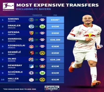 德甲除拜仁外引援转会费榜:哈维西蒙斯居首,登贝莱&奥尔莫在列