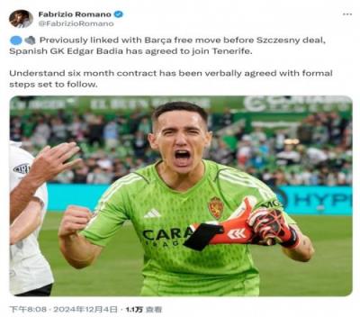 体育资讯12月4日报道宣称 据知名记者罗马诺透露,特内里费与西班牙门将巴迪亚就免签事宜达成口头协议。