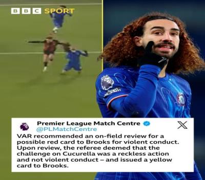 英超官方解释称:“VAR建议现场复查布鲁克斯犯规潜在的红牌事件。主裁判审查后,认为他对库库雷利亚的犯规是鲁莽行为而非暴力行为,并向布鲁克斯出示黄牌。”