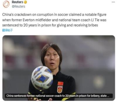 外媒也对此进行了报道。路透社写道:“中国在足球领域的反腐行动牵涉到一位知名人物,前埃弗顿中场球员、国家队教练李铁因行贿和受贿被判处20年监禁。”