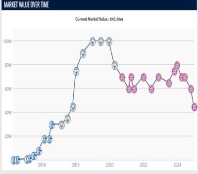 与今年一月8000万的身价相比,萨内一年内身价缩水高达43.8%。