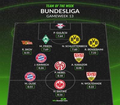 WhoScored德甲第13轮最佳阵容