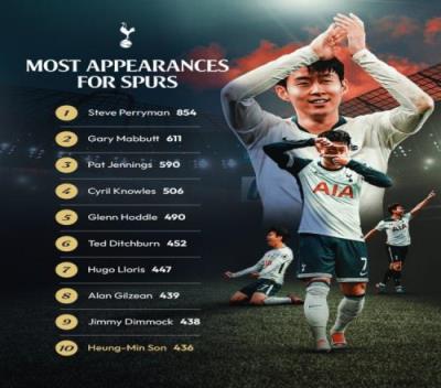 白鹿巷传奇!孙兴慜代表热刺出场436次,跻身队史出场次数榜前十