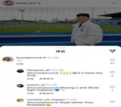 伊格莱西亚斯在武磊的这条社媒留下了一个“爱心”的表情。有西班牙人球迷回复伊格莱西亚斯:“想念你和武磊并肩作战的日子。”也有球迷调侃写道:“武磊比姆巴佩更好。”