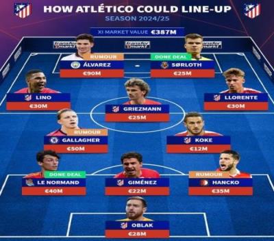 体育资讯8月7日报道宣 马竞在今夏一掷千金筹划多笔补强,《转会市场》也根据近期信息预测了马竞新赛季主力阵容,5位新援在列。