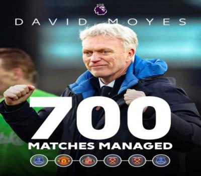 埃弗顿官方信息显示,莫耶斯成为第三位达成英超700战的教练,前两人是温格和弗格森。