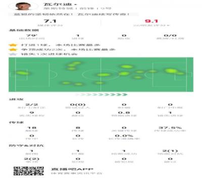 数据方面,瓦尔迪出战79分钟,2次射门2次射正,打进1球,措施一次得分机会;1解围,1拦截,1抢断,2次地面对抗1次成功,2次空中对抗全部成功。评分7.1分。