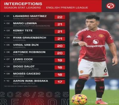 本赛季英超拦截次数前十:利马22次居首,赫拉芬贝赫、凯塞多在列