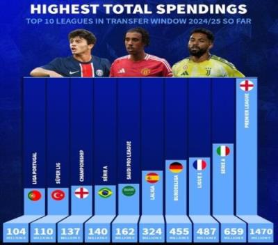 今夏各联赛支出:英超14.7亿,意甲6.59亿次席、西甲3.24亿第5
