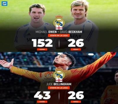 加盟皇马后,贝林厄姆在代表皇马出战的43场西甲比赛中打进了26球,追平了贝克汉姆和欧文的进球数,两人共代表皇马出战152场西甲比赛。