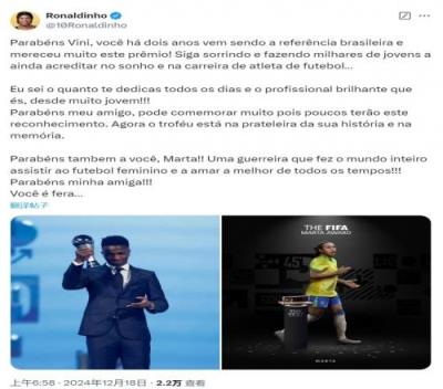 罗纳尔迪尼奥写道:“恭喜你,维尼修斯,过去两年里你一直是巴西足球的标杆,这个奖项是你应得的!保持微笑,鼓励成千上万的年轻人依然相信足球运动员的梦想和事业...”