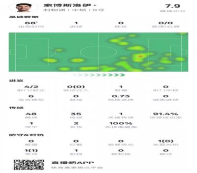 索博斯洛伊本场数据:1进球1关键传球&传球成功率91.4%,评分7.9