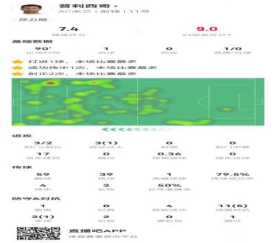 尽力局!普利西奇本场3射2正进1球1关键传球+4抢断获评7.4分