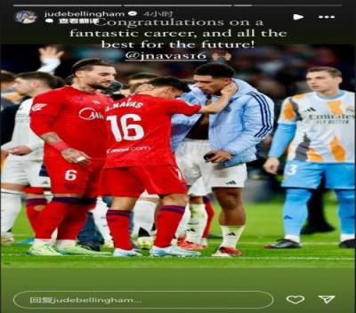 皇马中场贝林厄姆赛后晒出与纳瓦斯的合照,配文:“祝贺你度过精彩的职业生涯,祝未来一切顺利!”