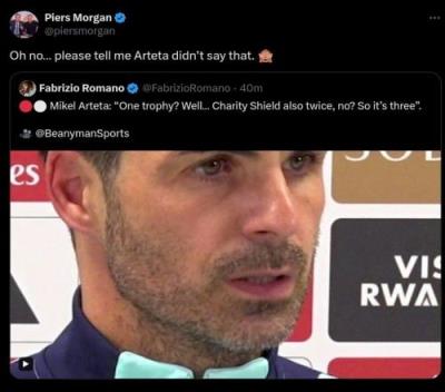 对此英国名嘴、阿森纳拥趸摩根在社媒评论道:“噢,不,请告诉我他没有说过这样的话。”