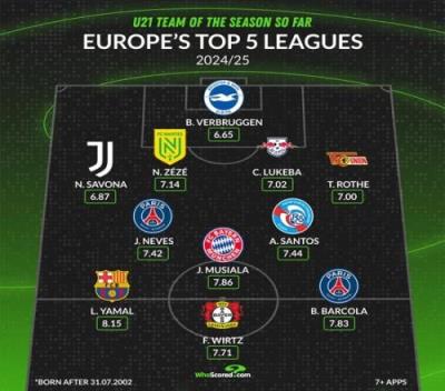 体育资讯11月13日报道宣称 WhoScored根据球员的评分列出了本赛季五大联赛U21最佳阵容,亚马尔、维尔茨、穆西亚拉在列。