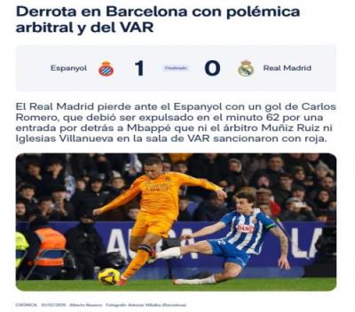 皇马因为卡洛斯-罗梅罗的进球输给了西班牙人,而罗梅罗本应在第62分钟因背后铲倒姆巴佩被罚下场,但主裁判穆尼兹-鲁伊斯和VAR室的伊格莱西亚斯-比利亚努埃瓦都没有给他红牌。