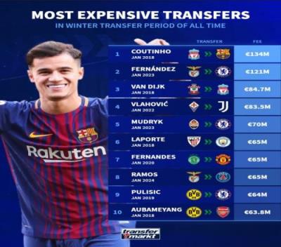 冬窗最贵转会榜:库蒂尼奥1.34亿欧居首,恩佐1.21亿欧次席