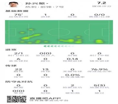 孙兴慜本场数据:1粒进球,2射1正,2次抢断,7对抗3次成功