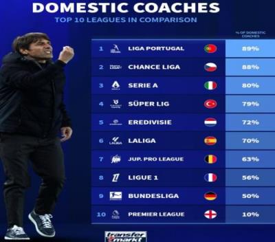 体育资讯12月20日报道宣称 《转会市场》统计了欧足联积分排名前十联赛的本国主帅占比,当前仅有2位“土帅”的英超无悬念垫底。