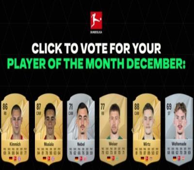 体育资讯1月8日报道宣称 德甲官方评选出12月最佳球员候选名单,其中拜仁两将基米希、穆西亚拉在列,以下为具体名单: