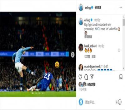 哈兰德在社交媒体上晒出自己比赛中射门的照片,配文:“昨天的大战和重要胜利!接下来是欧冠比赛,让我们加油。”