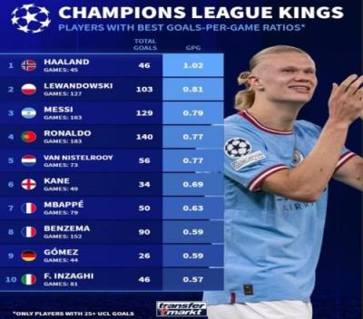 体育资讯1月23日报道宣称 欧冠战火重燃,《转会市场》也统计了欧冠历史场均进球效率情况,仅哈兰德能做到场均一球。