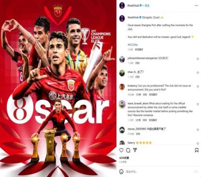 体育资讯12月25日报道宣称 据《东方体育日报》报道,海港曾主动联系亚足联,后者删除了告别奥斯卡的动态。