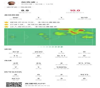 加克波本场3射2正进1球1助攻+2关键传球15对抗8成功+3造犯规