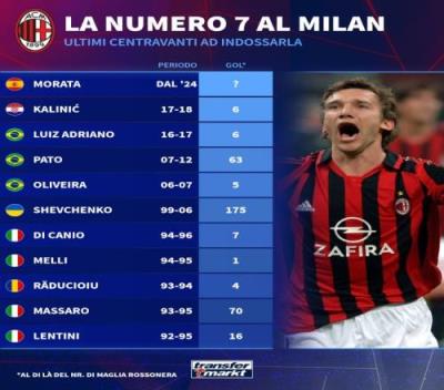 体育资讯7月19日报道宣称 米兰官方宣布从马竞签下西班牙前锋莫拉塔,球员将身披7号球衣。德国转会市场盘点了1992年以来米兰7号前锋的进球数量,其中舍甫琴科打进175球最多。