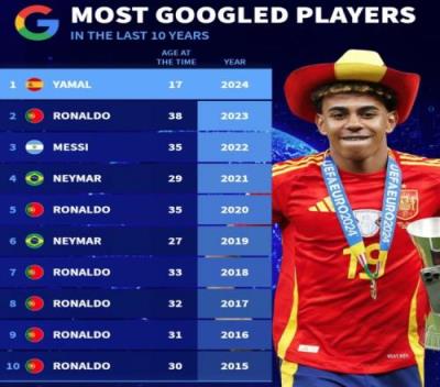 体育资讯12月27日报道宣称 《转会市场》统计了近10年谷歌被搜索最多球员情况,C罗6次登顶。