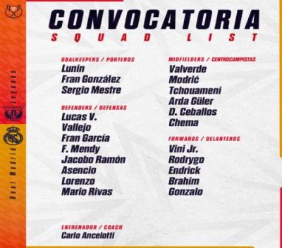 皇马国王杯大名单:姆巴佩、贝林、裤袜缺席,维尼修斯、魔笛出战