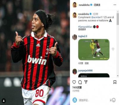 罗纳尔迪尼奥在社交媒体上晒出自己效力米兰时期的照片,配文:“祝贺AC米兰,125年的激情、成功和传统。”