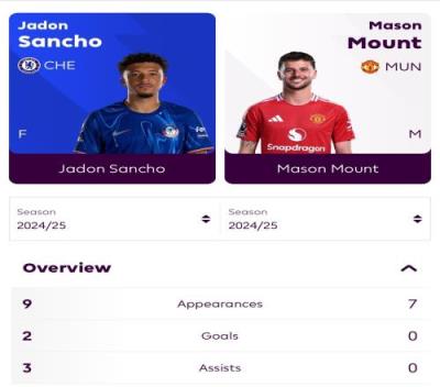 值得一提的是,去年以6000万镑转会费加盟曼联的芒特屡受伤病困扰,本赛季出场11次,没有取得进球或助攻。