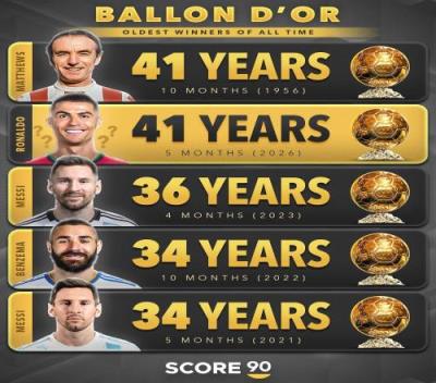 如果C罗在2026年获得世界杯并且获得金球奖,届时41岁5个月的他仍然不会是史上最年长的金球奖获得者。