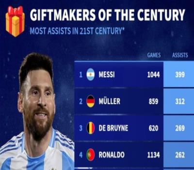 体育资讯12月26日报道宣称 《转会市场》统计了21世纪效力五大联赛的球员俱乐部+国家队各项赛事总助攻榜,梅西以399次居首。