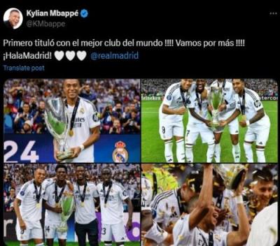 本场比赛姆巴佩首秀破门,赛后他也在个人社媒晒出多张与冠军奖杯以及众队友庆祝的照片,配文写道:“与世界最佳俱乐部一起赢得的第一个冠军!让我们去收获更多!Hala Madrid!”