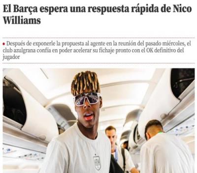 巴萨现在只希望尼科-威廉姆斯不仅能给出肯定的答复,而且最好能尽快做出决定,因为俱乐部需要尽快完成球队阵容的规划。巴萨已经开始筹措资金,准备支付威廉姆斯5800万欧元的解约金。然而,最终决定权在威廉姆斯手中:他可以选择接受巴萨的报价,也可以在毕尔巴鄂再待一年,或者接受来自英超俱乐部更高的报价。