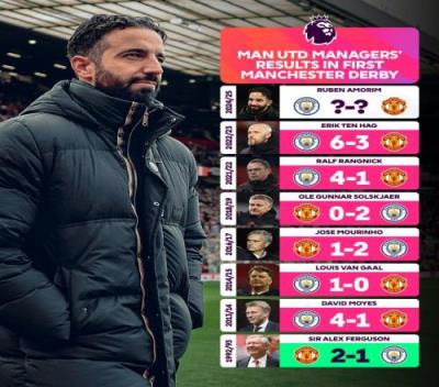 这次如何曼联主帅首场英超曼市德比战绩1胜6负,仅弗格森取胜