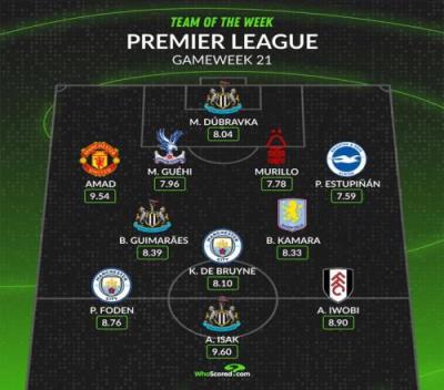WhoScored英超第21轮最佳阵:伊萨克、德布劳内、阿玛德在列