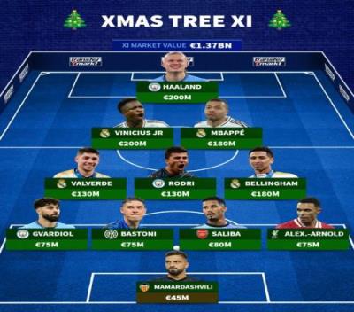 德转排圣诞树阵型阵容:6位亿元先生领衔总身价13.7亿欧