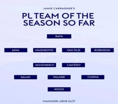 体育资讯1月1日报道宣称 前红军球员卡拉格评选出本赛季至今英超最佳11人阵容,其中萨拉赫、帕尔默等在列,以下为具体阵容: